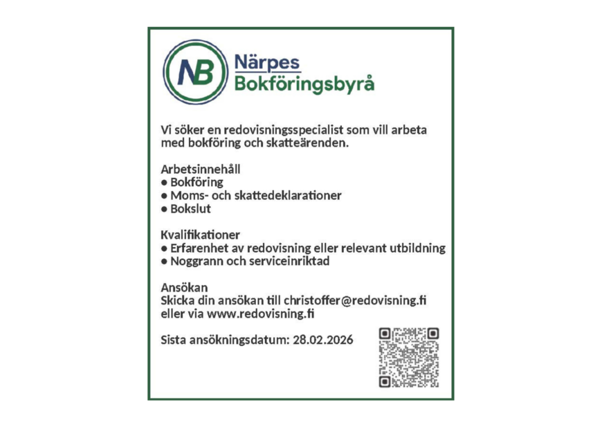 Närpes församling söker säsongsarbetskraft för timanställningar vid begravningsplatserna i Närpes, Övermark och Pörtom sommaren 2026. Sök anställning via:…